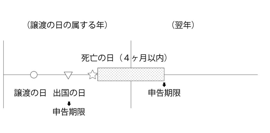 譲渡した人が出国する場合や死亡した場合の譲渡所得の申告期限は、次のように定められています。